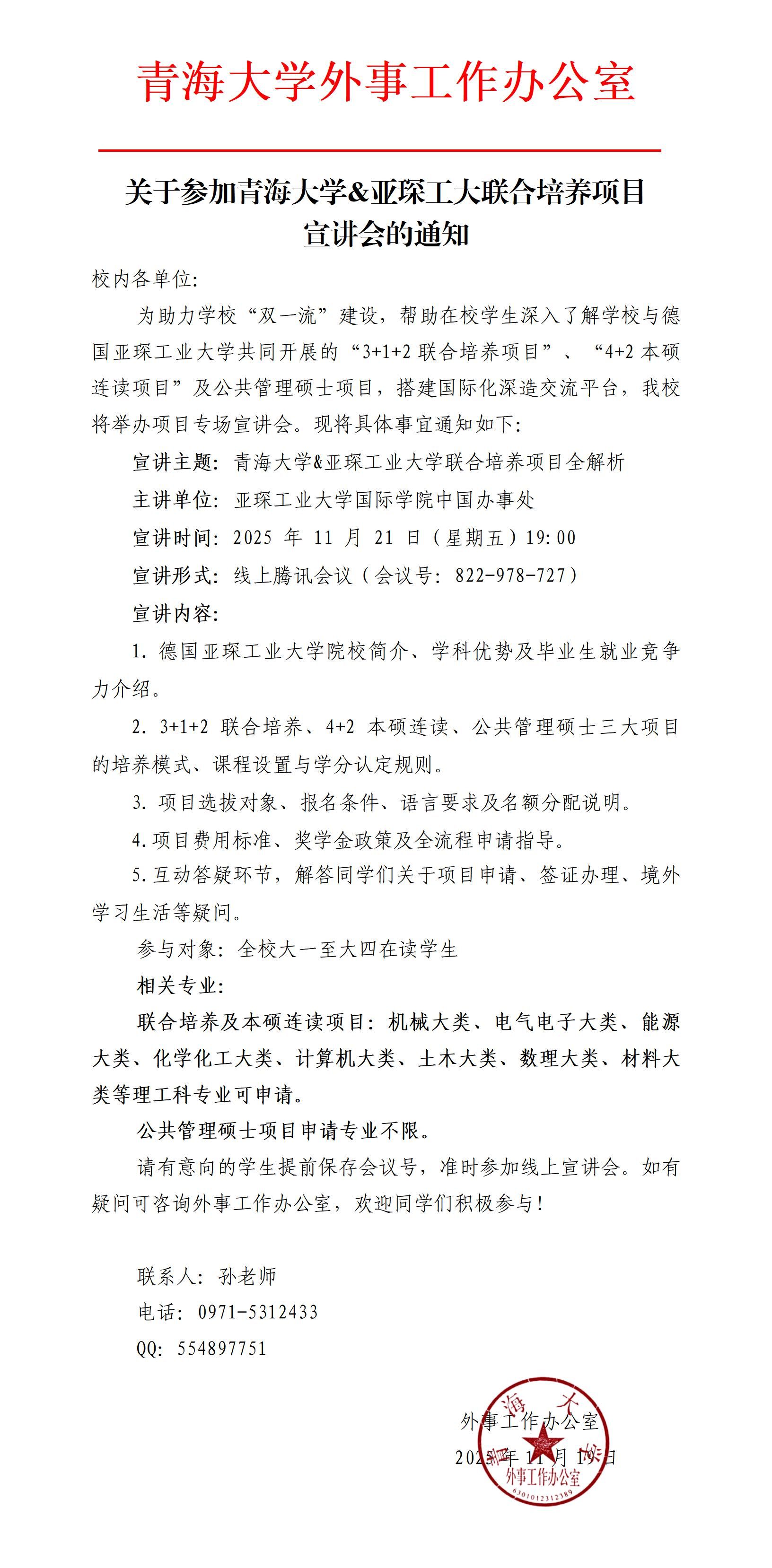 关于参加青海大学&亚琛工大联合培养项目 宣讲会的通知