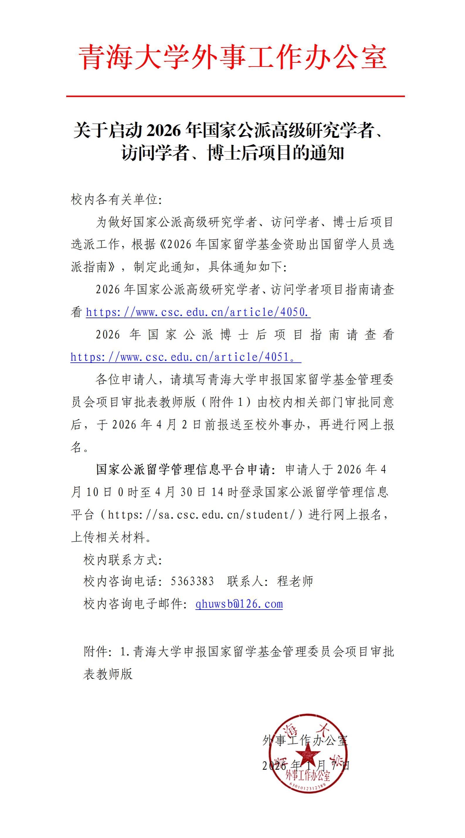 关于启动2026年国家公派高级研究学者、访问学者、博士后项目的通知