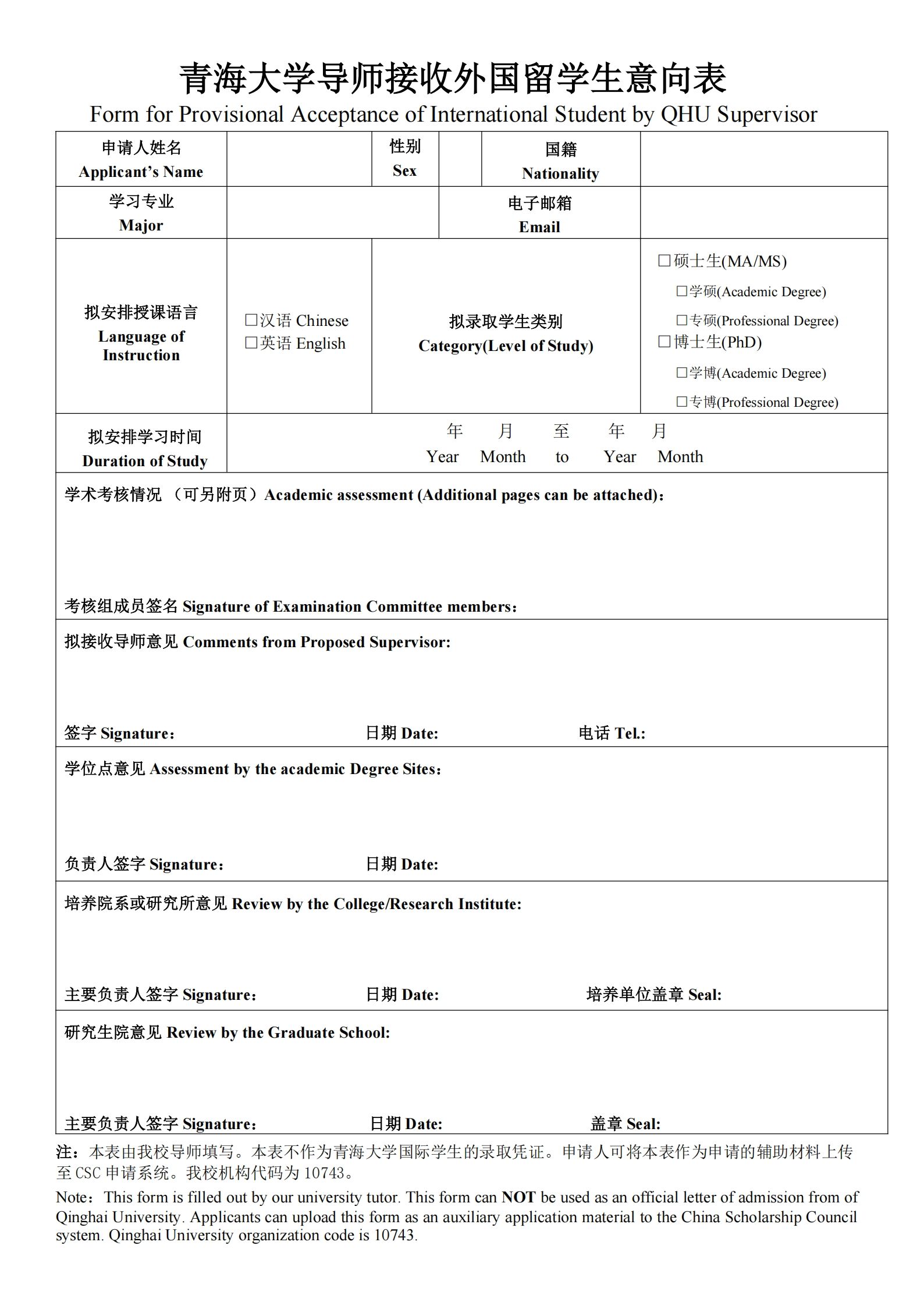 -青海大学导师接收外国留学生意向表_