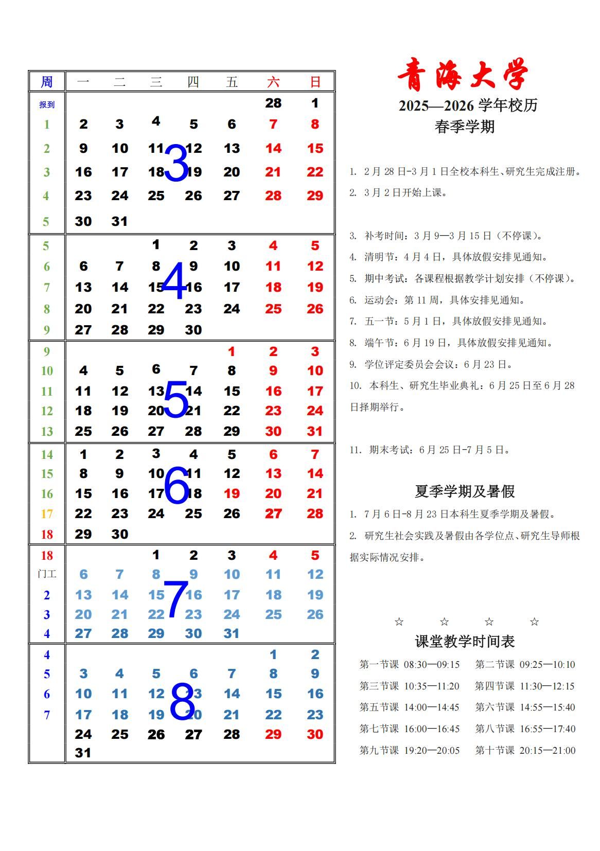 青海大学2025-2026学年校历