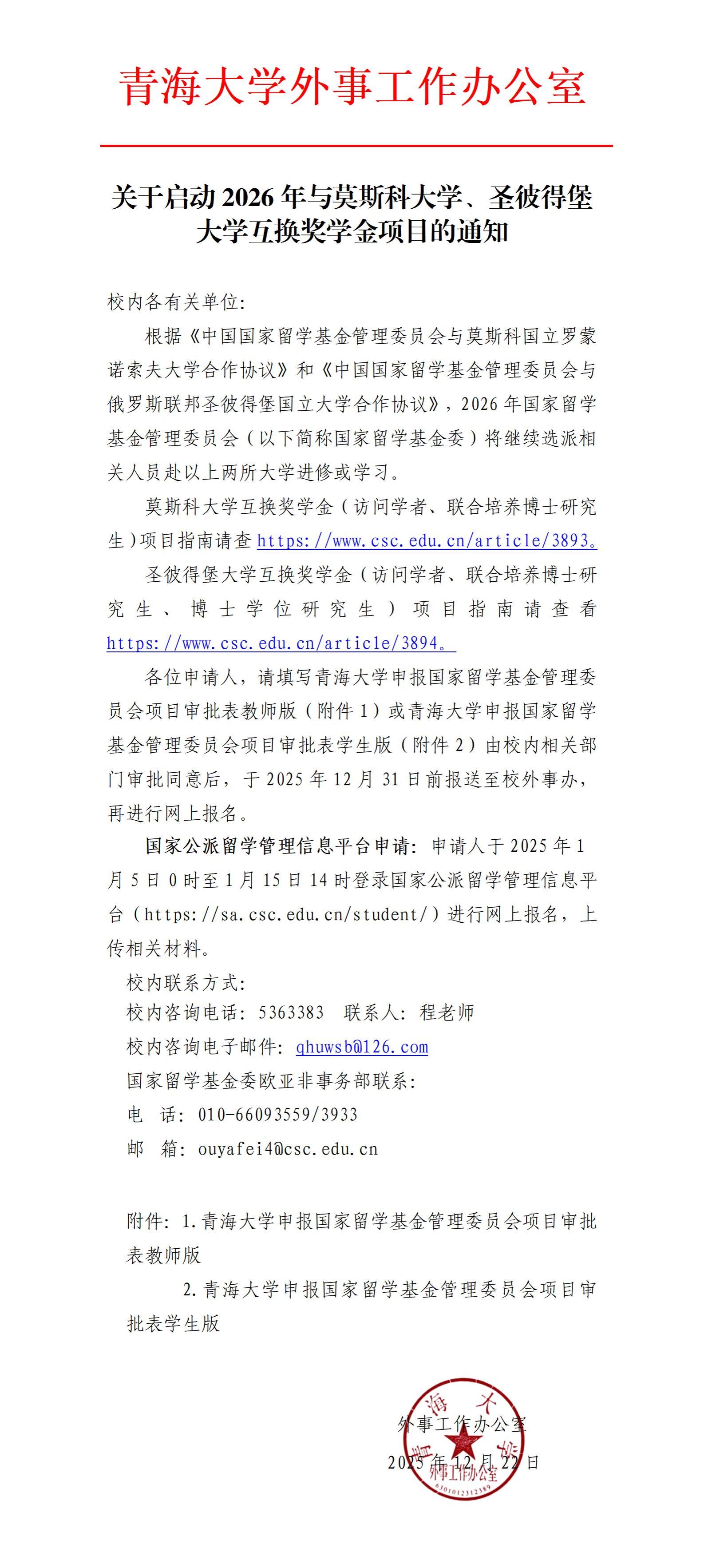 关于启动2026年与莫斯科大学、圣彼得堡大学互换奖学金项目的通知