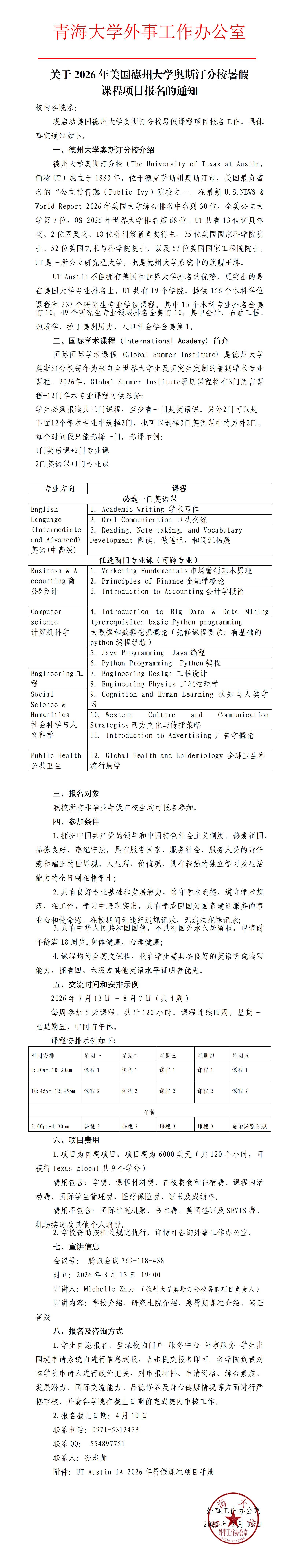 关于2026年美国德州大学奥斯汀分校暑假课程项目报名的通知